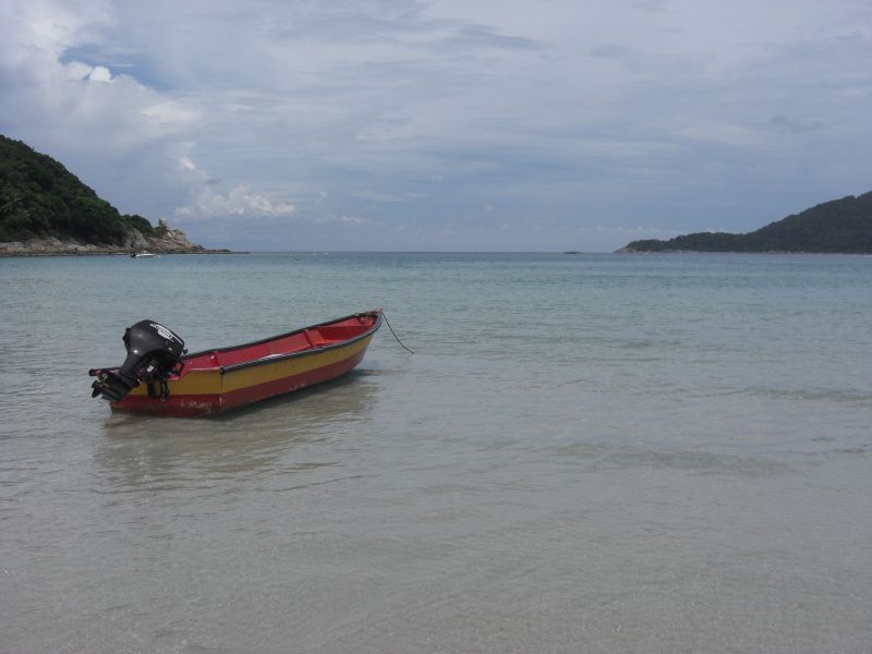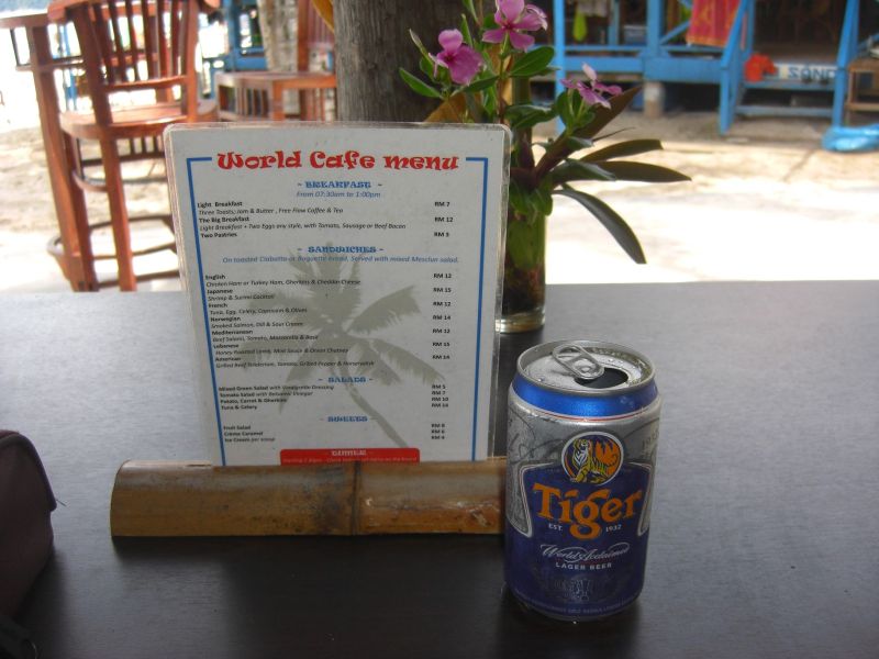 Morgens in Kuala Besut erst mal gefrühstückt, das Wetter: leicht regnerisch. Dann mit dem (großem) Speedboot auf Pulau Perhentian Kecil übergesetzt, am Coral Bay ausgestiegen und Enttäuschung: kein schöner Strand, die Unterkünfte aber günstig, z.B. Aur Bay: Chalet mit eigenem Bad für 35 MYR, Maya Chalet Beachfront: großes Chalet mit eigenem Bad für 65 MYR, aber der Strand war nicht das meine. Wie sollte es weitergehen? Rein zufällig noch eine Wienerin und einen Spanier getroffen, die vor demselben Problem standen. Ich hatte schon vorher ein wenig nachgeforscht und so fuhren wir 3 mit dem Taxiboot zum einsamen Mira Beach, nur 1 Resort mit 10 Hütten. Ja, das war es: ruhig gelegen, auf Backpacker ausgelegt.