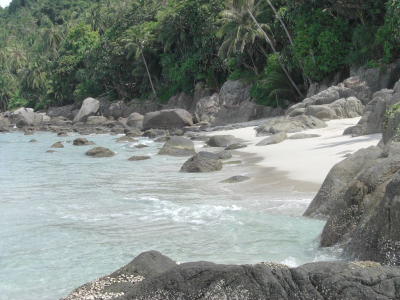 Morgens in Kuala Besut erst mal gefrühstückt, das Wetter: leicht regnerisch. Dann mit dem (großem) Speedboot auf Pulau Perhentian Kecil übergesetzt, am Coral Bay ausgestiegen und Enttäuschung: kein schöner Strand, die Unterkünfte aber günstig, z.B. Aur Bay: Chalet mit eigenem Bad für 35 MYR, Maya Chalet Beachfront: großes Chalet mit eigenem Bad für 65 MYR, aber der Strand war nicht das meine. Wie sollte es weitergehen? Rein zufällig noch eine Wienerin und einen Spanier getroffen, die vor demselben Problem standen. Ich hatte schon vorher ein wenig nachgeforscht und so fuhren wir 3 mit dem Taxiboot zum einsamen Mira Beach, nur 1 Resort mit 10 Hütten. Ja, das war es: ruhig gelegen, auf Backpacker ausgelegt.