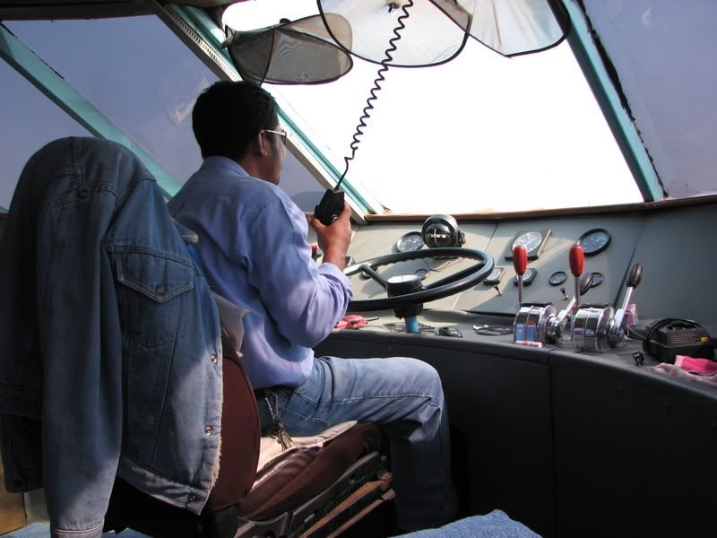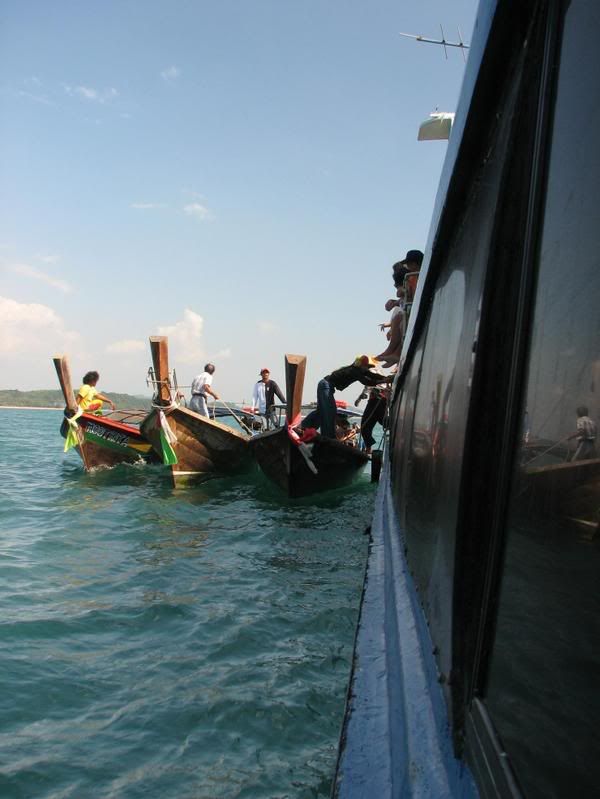 Wir haben uns (das Longtailboot mit 3 Mann Besatzung und 2 Gästen) am Treffpunkt mit der Fähre auf See mit den Jungs vom Nachbaresort getroffen. Da die Fähre Verspätung hatte, und unsere Resort-Jungs irgendwie keinen Bock hatten zu warten sind wir 2 Gäste dann rüber auf das andere Bötchen (wir Gäste wurden sogar gefragt ob es okay ist!) . Dazu mußten die Boote erstmal aneinander geteut werden. Dummerweise waren die Lassotricks nicht ausreichend und der Motor mußte angeworfen werden, für 3 Meter!