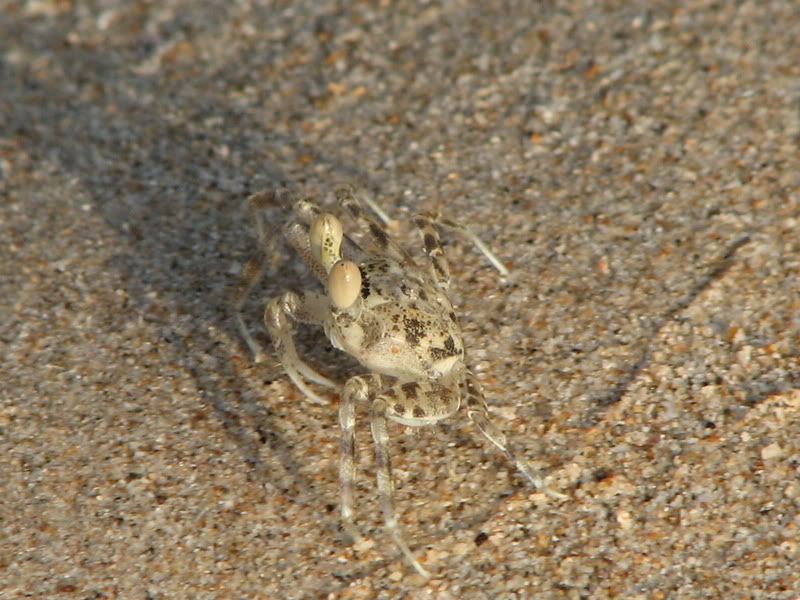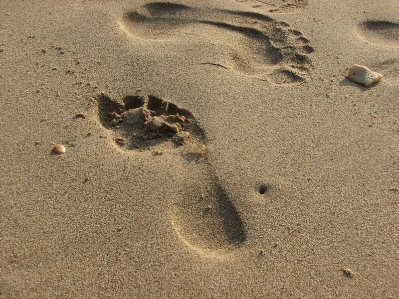 An den Stränden gibt es übrigens winzige Krebschen , eine "Behausung" von denen ist das Löchlein neben dem Fußabdruck!