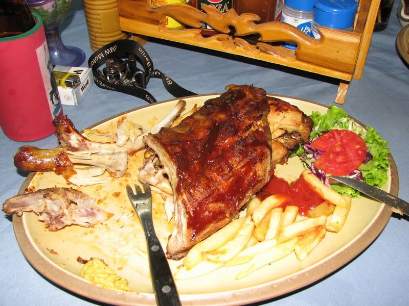 Es gibt viele gute Restaurants, ob "Isaan-oder Farang-Food", aber die Rippchen in der Taverne bleiben mir in Erinnerung (okay, die Spieße im , wie hieß das?, Bootshaus!?, auch), unter der halben Portion Rippchen (zu sehen ist nur noch die Hälfte der "Halben Portion"!), machte es sich auch noch ein halbes Hähnchen gemütlich!