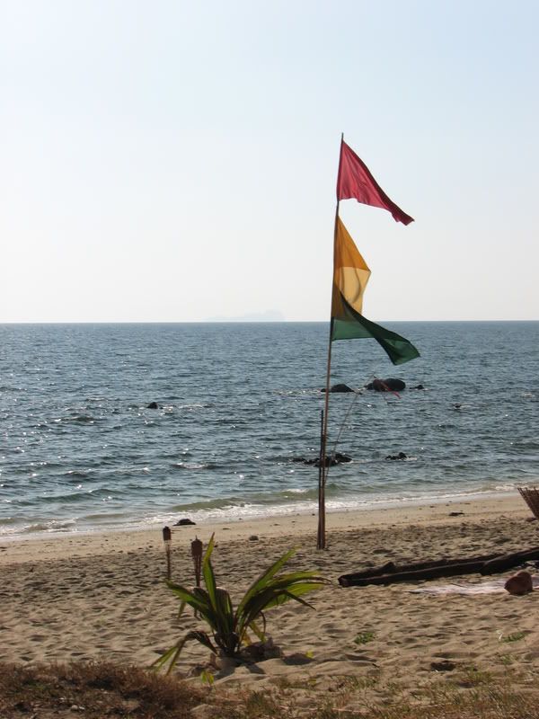Thai-Baywatch halt : Grün=Am Strand sicher, Gelb= Bis zu den Knien aufpassen, Rot=weiter raus besser lassen.
