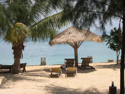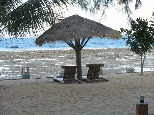 Von den Bungi’s, der Anlage und den Mitarbeiten waren wir allerdings ein wenig enttäuscht, wo das Coco doch im Forum immer so gelobt wurde. Meinem Schatz stand das Entsetzen ins Gesicht geschrieben – keine Klimaanlage und das Bad im Freien (hhmm … ICH wusste das ja – hab’s ihm aber aus gutem Grund vorenthalten … psssssttt) !! Naja … wir sind dann erst mal ins Wasser gehüpft, was nun wirklich keine Abkühlung bot … und haben uns dabei den ersten fetten Sonnenbrand zugezogen. Der nächste Schock dann bei der Getränkebestellung: Für ein Glas mit Eiswürfeln musste man 5 THB extra zahlen, was nicht gerade zur Steigerung der guten Laune bei meinem Freund beitrug. Allgemein fanden wir die Preise für Essen und Getränke ziemlich überteuert (und das Argument von wegen Insel und alles muss angekarrt werden …. naja). Als dann noch die Ebbe einsetzte, das Wasser gänzlich verschwand, und ein Haufen Schrott und Steine zutage förderte, war auch ich von der Idylle der Insel nicht mehr wirklich überzeugt. Das sah schon ECHT hässlich aus.