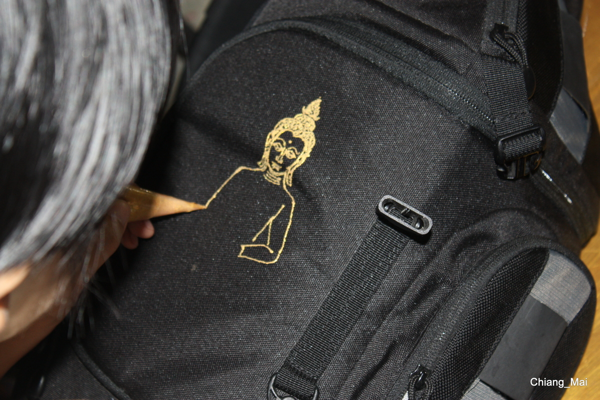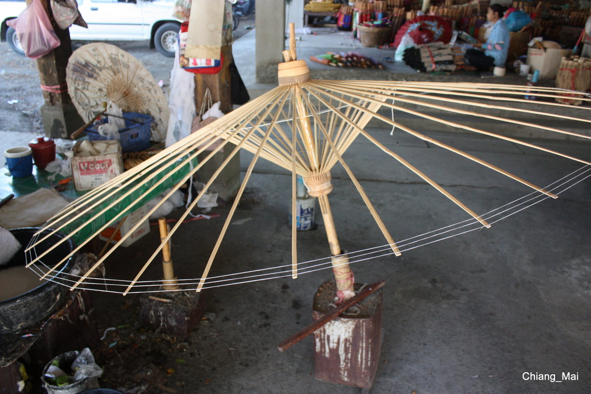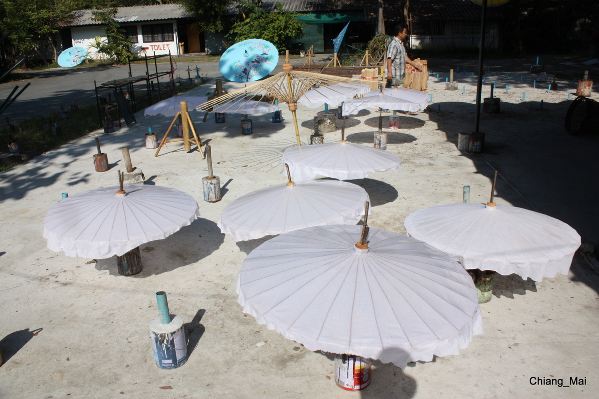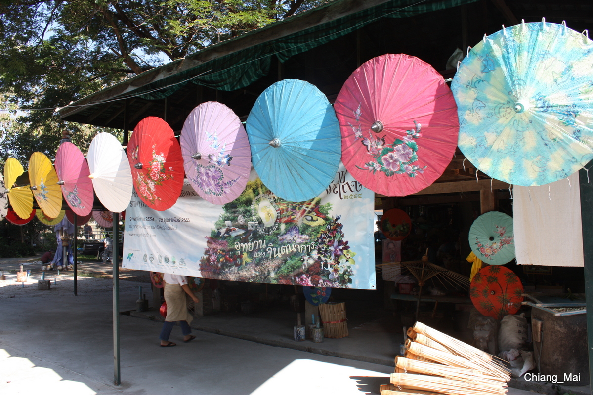 Es war schon später Nachmittag, deswegen vergeudeten wir auch keine Zeit und führen per tuk-tuk zur umbrella factory. Wir waren letztes Jahr schon dort um uns die Fertigung der bunten Papierschirme anzusehen und waren diesmal hauptsächlich dort um Souveniers die wir uns schon zu Hause überlegt hatten einzukaufen und meinen Fotorucksack bemalen zu lassen. Ein handbemalter Regenschirm und ein großer Fächer mussten diesmal mit. Zu lang für die Koffer mussten wir bei den Inlandsflügen und beim Heimflug immer betteln dies als zusätzliches Handgepäck mitnehmen zu dürfen.