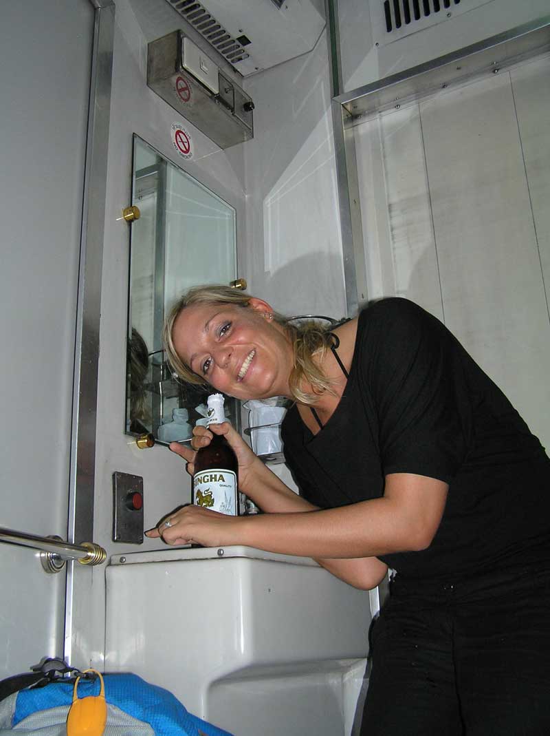 Ha da fing alles schon wieder ganz typisch für uns an, wir wollten weil wir nur noch 500 Baht hatten am Bahnhof noch Geld ziehen, aber leider war der ATM kaputt.. der Zug stand auch schon da und somit sind wir mit den 500 Baht ab in unser erste Klasse Abteil. Nachdem wir dann so ca. 5 Minuten sitzen und unsere Bestellung fürs Abendessen, lecker Panang Curry aufgegeben haben, haben wir wieder meinen persönlichen Freund Mr. Schabo getroffen, ich sag noch „Ach du auch hier?“ und dann nur noch: „Deine ganze Familie hast du wohl auch mitgebracht“. So kam´s das wir kurz nach dem Einstieg in unser Komfort Abteil (-: für Leichen gesorgt haben.. die erste Stunde war ich nur damit beschäftigt Mr.Schabos Familie die unter Pit´s Bett wohl eine Großraum Wohnung hatte mit dem Schlappen zu erledigen..