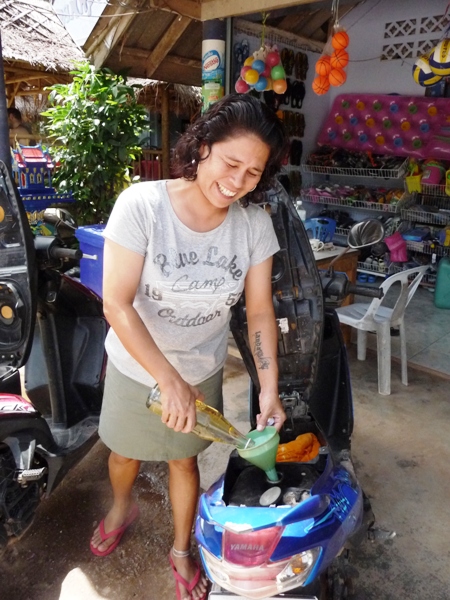 Wir hielten vor dem Same Same but Different an und fragten um Hilfe. Ein Beschaeftigter schwang sich mit 1000 Baht von Dominique auf den Roller und fuhr zur Werkstatt. Nach 20 Minuten war er wieder da und Dominique um 180 Baht aermer. Da wir endlich mal ans Wasser wollten und es uns so gut gefiel, stuerzten wir uns an den Strand und in die Fluten. War das toll :huepf Die hohen Wellen entledigten uns in Sekundenschnelle unserer Bikinis :-)