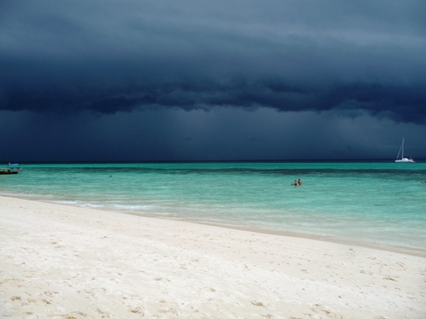 Nach einer halben Stunde bemerkte Dominique dann eine dunkle Front am Himmel und sagte zu Mia: Schau mal, die kommt wohl direkt auf uns zu.