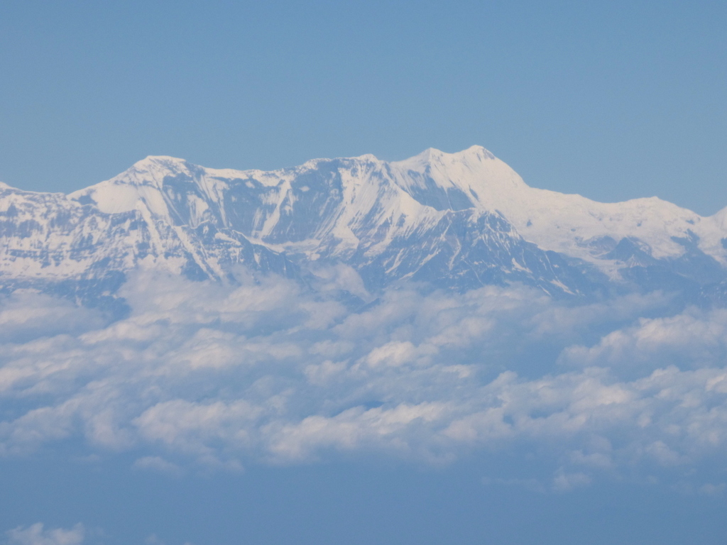 Ohne großes Warten konnten wir die Koffer abgeben, durch den Zoll und auf den check in warten. Tja und dann tschüß und weg. Erste Etappe nach Doha wo wir diesmal leider fünf Stunden Aufenthalt hatten. So konnten wir aber den gerade erst fertig gestellten neuen Flughafen bewundern, essen und etwas herum laufen bevor es zur zweiten Etappe weiter ging. Durch die Informationen in den Reiseführern wussten wir dass man am besten einen Sitzplatz auf der linken Seite des Fliegers reserviert um beim Landeanflug auf Kathmandu den Himalaya zu sehen. Es hat sich gelohnt, wurden wir doch mit einem grandiosen Ausblick belohnt. Den ganzen Flug über hab ich mich gefragt ob irgendjemand tatsächlich Angst hat dass ich da draußen herum klettere.