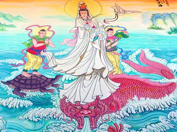 in chinesischen Tempeln faellt mir immer wieder die Figur einer Heiligen in weissem Gewand auf. Auch findet sich immer wieder eine Schildkröte die auch eine Rolle zu spielen scheint.
